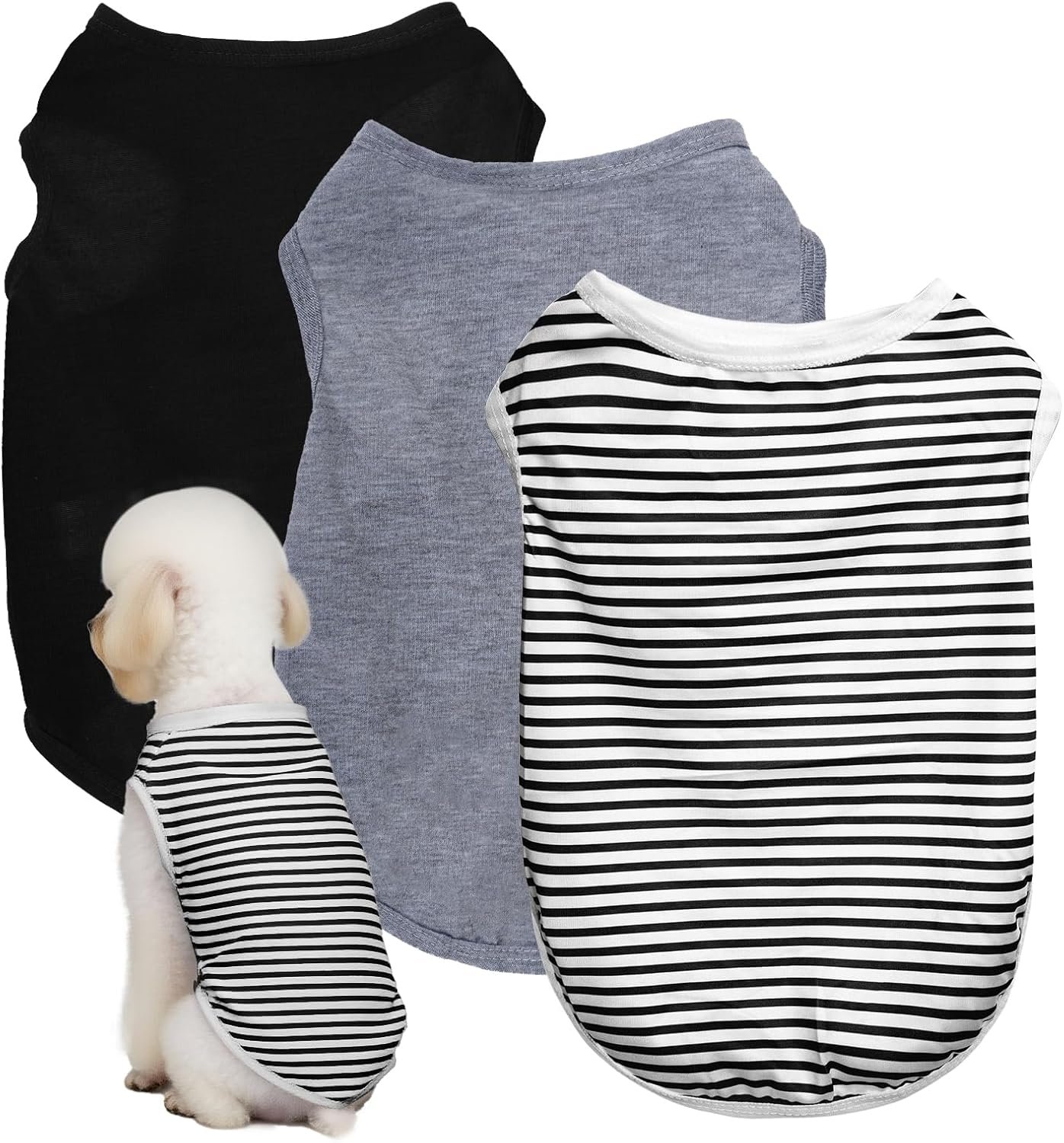- PACKAGE INCLUDED:you will receive 3pcs sleeveless puppy clothes, this set have Black, Grey color and have solid color,stripe 2 styles,you can choose different one for your pet different styles.